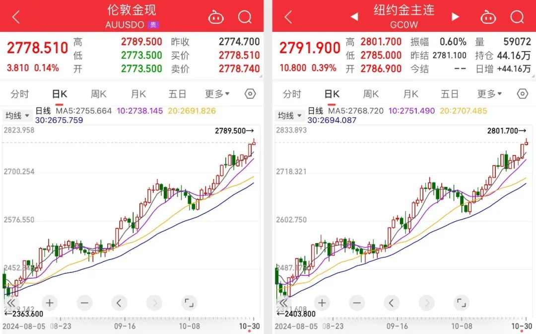 北京时间10月30日,国际国内金价又一次迎来历史新高。同花顺数据显示,截至晚间发稿,COMEX黄金期货价格报2791.9美元/盎司,盘中最高一度超2800美元/盎司;截至当日收盘,沪金主力合约盘中最高报639.48元/克。