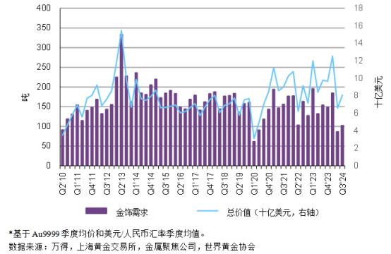 世界黄金协会10月30日发布的《2024年三季度中国黄金市场回顾与趋势分析》显示,受季节性趋势提振,今年第三季度,中国市场金饰需求环比反弹19%;但在金价和经济因素的综合影响下,金饰消费较去年同期下降34%,2024年三季度的销量创下自2010年(119吨)以来同期新低,低于十年均值36%。年初至今,中国金饰需求总量为373吨,同比下降23%。