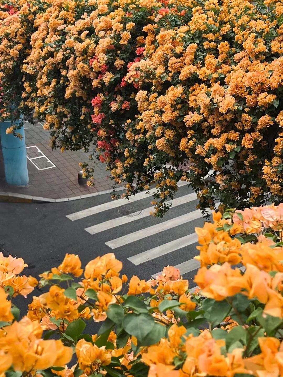 不管是站在天桥上面拍照,还是走在人行道上,与金色的三角梅花海不期而遇,邂逅浪漫,都是那么美好。