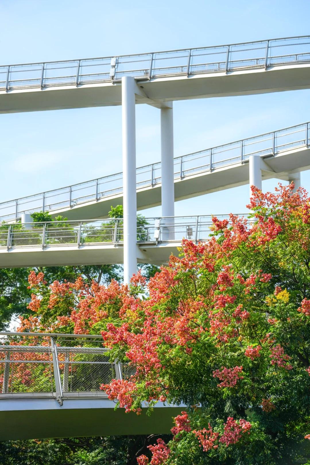 这个天桥是直角L形,并且折线双道,从不同角度拍照都能呈现多层的三角梅花海景观,11月盛花时期,拍照很出片!