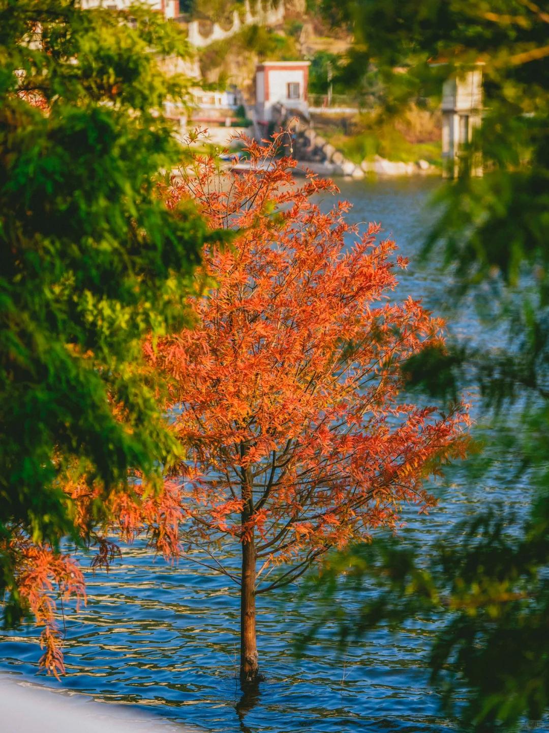 高耸挺拔的落羽杉,层林尽染,与碧波荡漾的湖水相映成趣,宛如一幅流动的油画。