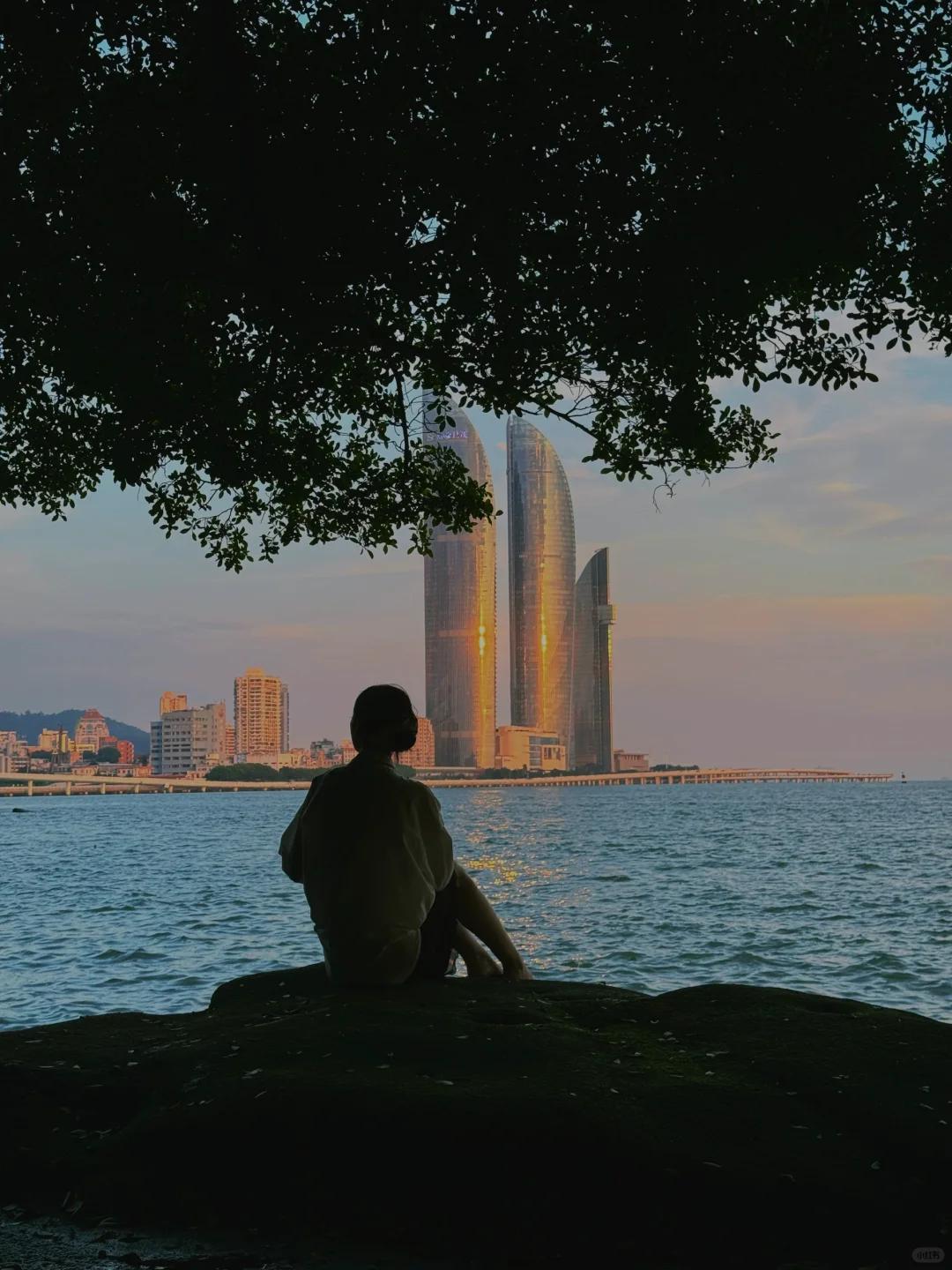 环岛路上有一座音乐广场。有排面前大海的长椅,两棵大树做的画框好好看,静等日落晚霞真的无敌治愈!