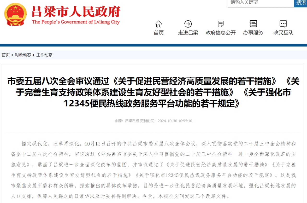 10月30日消息,10月11日召开的中共吕梁市委五届八次全体会议,深入贯彻落实党的二十届三中全会精神和山西省委十二届八次全会精神,审议通过《中共吕梁市委关于深入学习贯彻党的二十届三中全会精神 进一步全面深化改革的实施意见》,擘画了吕梁进一步全面深化改革的蓝图,并审议通过了《关于促进民营经济高质量发展的若干措施》《关于完善生育支持政策体系建设生育友好型社会的若干措施》《关于强化市12345政务服务便民热线平台功能的若干规定》。