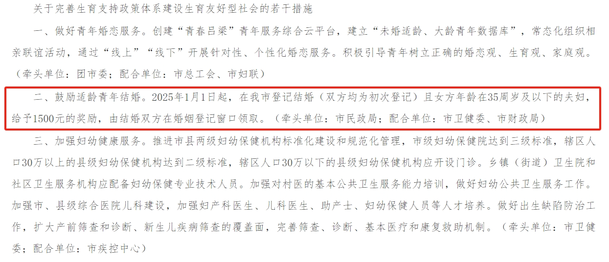 二、鼓励适龄青年结婚。2025年1月1日起,在我市登记结婚(双方均为初次登记)且女方年龄在35周岁及以下的夫妇,给予1500元的奖励,由结婚双方在婚姻登记窗口领取。(牵头单位:市民政局;配合单位:市卫健委、市财政局)