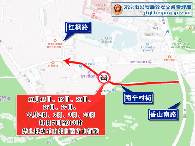 特别提示:香山红叶观赏季期间,游客数量将大幅增加,为确保红叶观赏季期间香山地区的道路交通安全与畅通,2024年11月2日、3日、9日、10日,每天7时至19时,将对南辛村街(红枫路至香山南路段)禁止机动车由东向西方向行驶的临时交通管理措施。