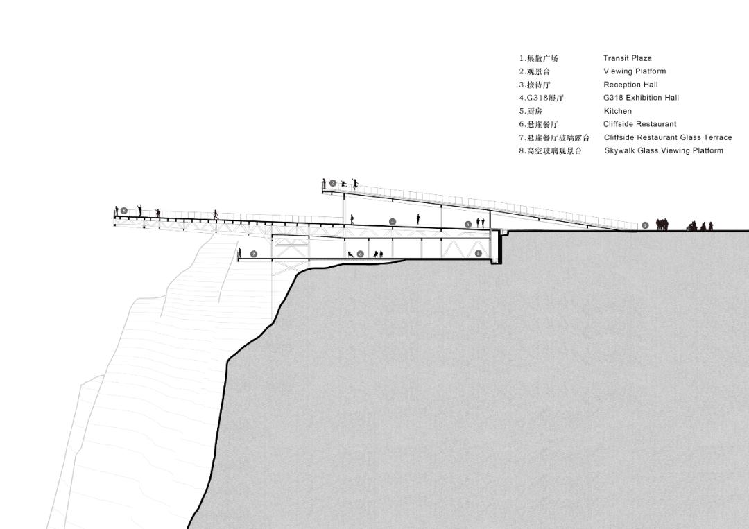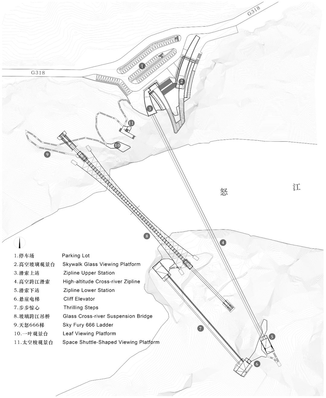 ▲ 跨江高空玻璃吊桥从怒江北岸的停车场跨入G318展览馆,感受建造川藏公路不畏艰险创造奇迹的历史和精神,同步了解怒江72拐大峡谷景区艰难的建造历程。然后登上高空玻璃观景台,体验怒江上空一段心惊动魄的“天路”,转乘跨江滑索飞跃到怒江南岸,通过悬崖观光电梯速降50米,沿着步步惊心挑战桥和跨江玻璃吊桥回到怒江北岸,再经过望而却步的天怒666梯爬升80米回到停车场,在海拔2700多米的怒江峡谷,两个小时悄然而逝。虽然只有80米的高差,但游客回到停车场的时候,内心将充斥着超越开车翻越5000米海拔垭口的喜悦和激动!在这里,怒江72拐不再只是一个传说中被汽车裹挟着的“惊险”概念,而是一次真正意义的刻骨铭心的挑战和体验。高空玻璃观景台下方还有极具体验感的悬崖餐厅、咖啡吧和多功能超市。整个项目具有非常丰富的参与性、互动性和挑战性。