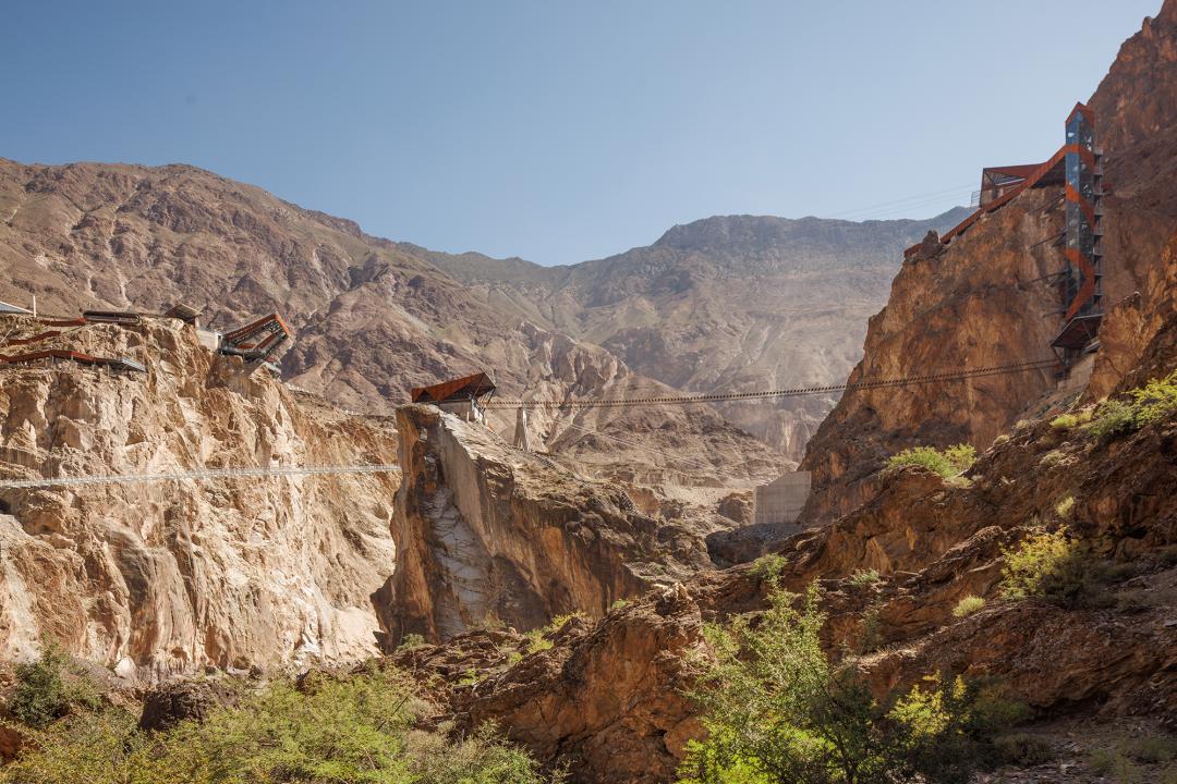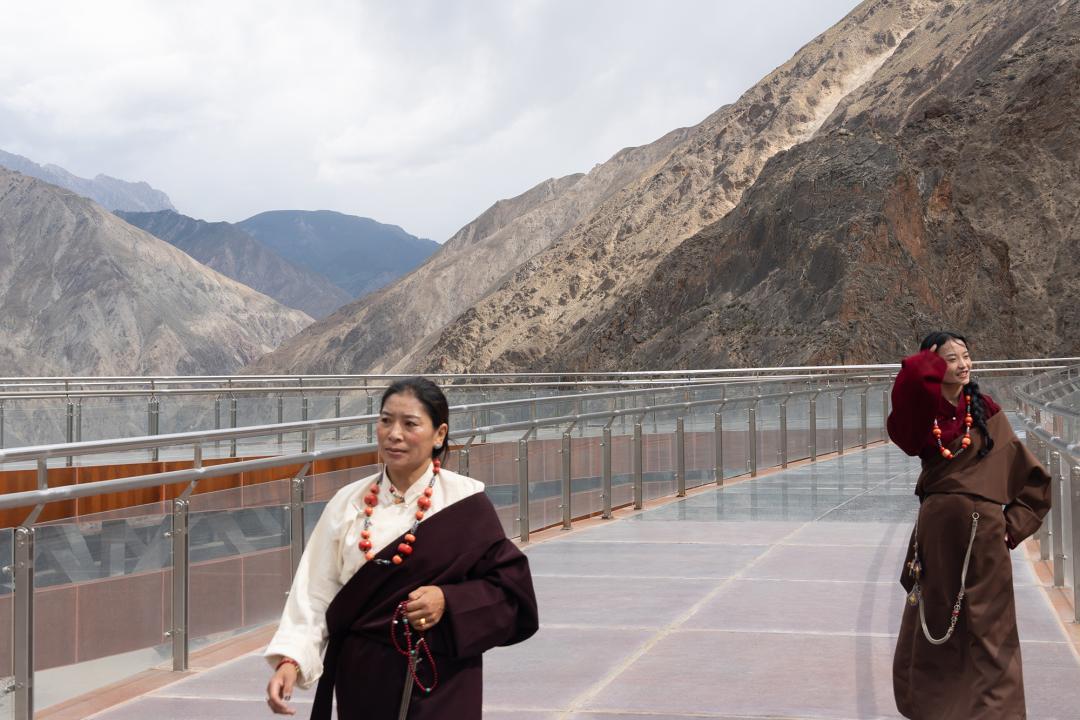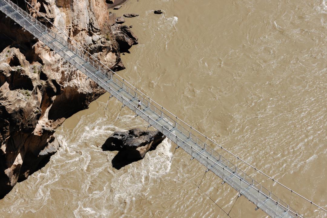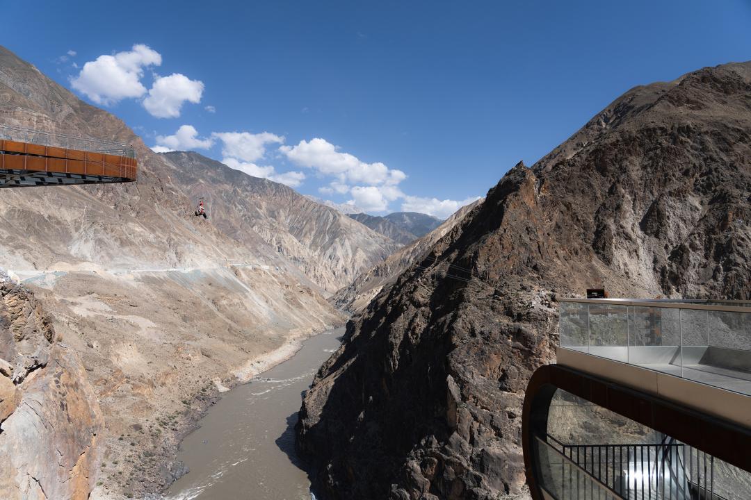▲ 旅客在天路上打卡横跨怒江的滑索、步步惊心挑战桥和跨江高空玻璃吊桥的设计灵感都来自建造318的各种特殊施工场景。景区的设计、建造和未来游客的游玩体验,都展示了极大的挑战精神,是对创造川藏公路伟大奇迹的一次致敬。