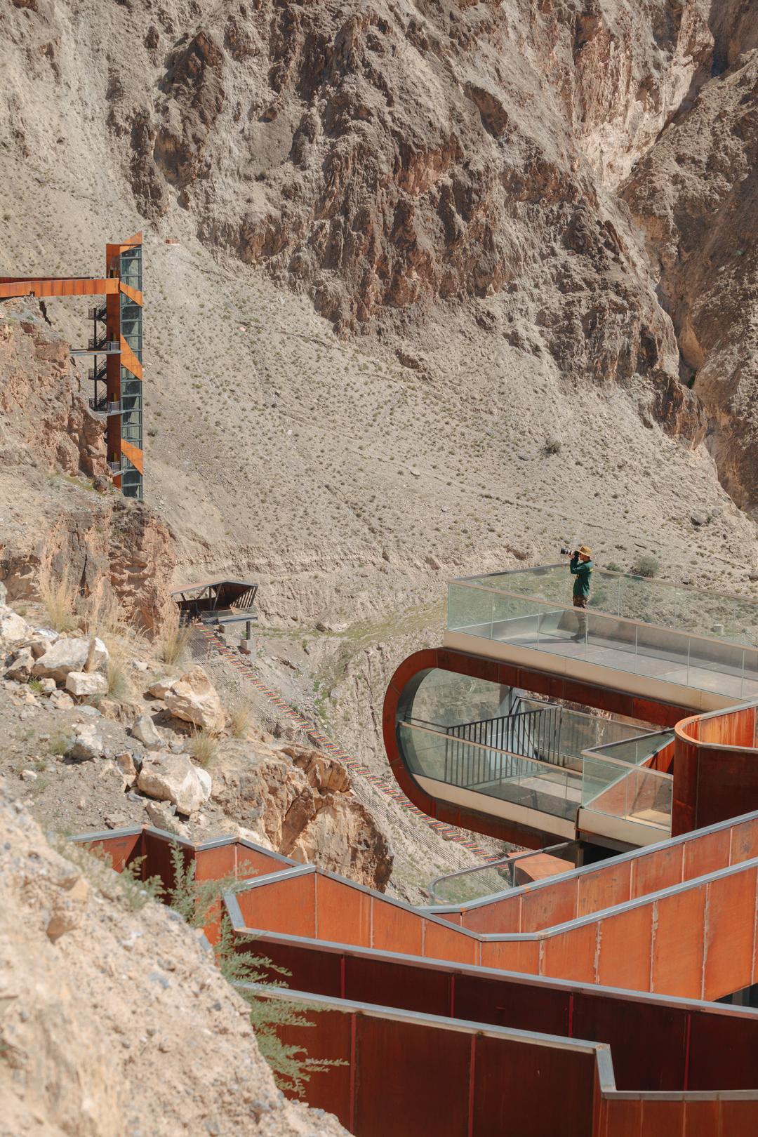 ▲ 观景台屹立在沧桑雄阔的崖壁上景区坐落在怒江大峡谷的一处悬崖之上,北面是蜿蜒而过的318国道,南面可俯瞰怒江咆哮东去,四周被巍峨的高山环绕,目之所及尽是黄土覆盖的苍茫之境。景区核心建筑高空玻璃观景台,以怒江72拐标志性的“发卡弯”道路线型为象源。采用钢桁架结构结合藏红色耐候钢板作为主材,在怒江崖壁之上悬挑最远约37米,地面铺设高透安全玻璃,在怒江上空形成一条名副其实的“天路”。