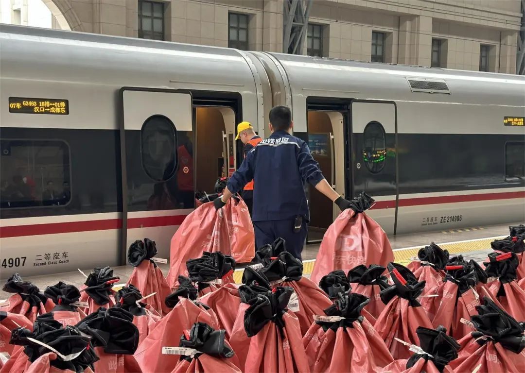 11月1日8时58分,G3463次列车装载水果、厨具、针织品、文件、手机等多个品类、总重达2吨的快递物资,从汉口站驶出,一路飞驰奔西,7个多小时将抵达成都东站。