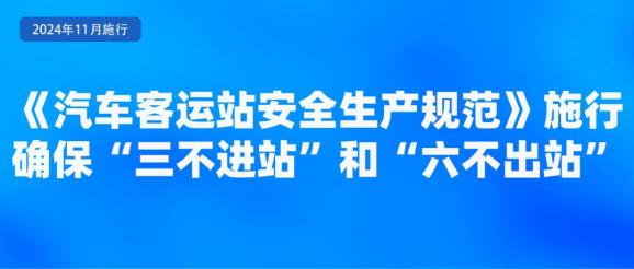 交通运输部修订印发《汽车客运站安全生产规范》,于2024年11月1日起施行。《规范》明确,汽车客运站经营者应当对进出汽车客运站候车区和发车区的人员和行李物品、车辆进行严格检查,确保“三不进站”和“六不出站”。“三不进站”是指:危险品不进站、无关人员不进站(发车区)、无关车辆不进站(发车区)。“六不出站”是指:超载或违规装载营运客车不出站、安全例行检查不合格营运客车不出站、旅客未系安全带不出站、驾驶员资格不符合要求不出站、营运客车证件不齐全不出站、“出站登记表”未经审核签字不出站。详细阅读>>