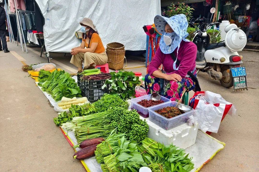 每周六,勐龙镇各村委会的村民们会带着自家的农特产品前来赶摆,帐篷下的商品琳琅满目,摊位一个挨着一个,俯瞰像排列整齐的彩色拼图,充满了生活的烟火气和浓浓的人情味。