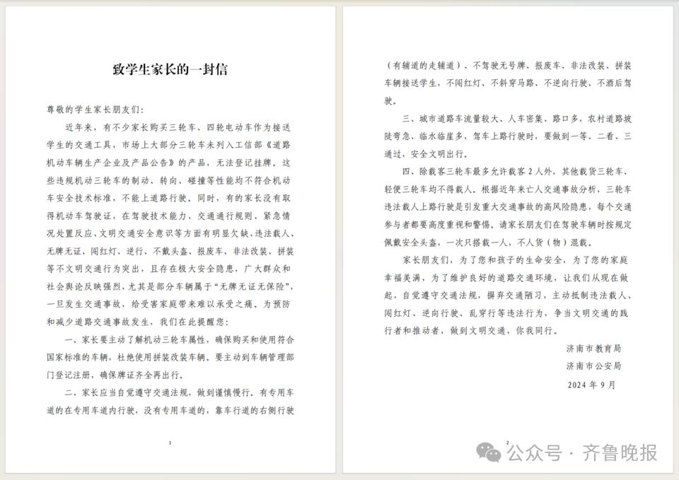 今年9月,济南市教育局、济南市公安局发布了“致家长的一封信”,提醒家长主动了解机动三轮车属性,确保购买和使用符合国家标准的车辆,主动到车辆管理部门登记注册,确保牌证齐全再出行。