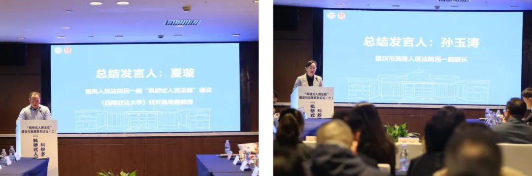 闭幕式由沙坪坝法院党组书记、院长周轶主持,“枫桥式人民法庭”建设(西南政法大学)研究基地副教授夏璇、重庆市高级人民法院民一庭庭长孙玉涛作总结发言。