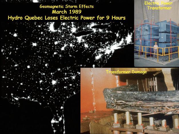 太阳风暴对人类生活造成的威胁与危害是多方面的。历史上著名的“魁北克事件”是其中的一个例子。1989年正值第22个太阳活动周期的黑子数高峰年,仅在一个月内,太阳风暴就先后产生了约107次太阳X射线耀斑,其日冕物质的抛射也高达数十次。太阳风暴的“席卷”,造成多起重大电力系统故障,加拿大魁北克省的大部分地区停电长达9小时以上,600万居民生活受到严重影响。强烈太阳耀斑引起过39次强烈短波通讯突然骚扰,其中15次通讯部分中断,24次全部中断。