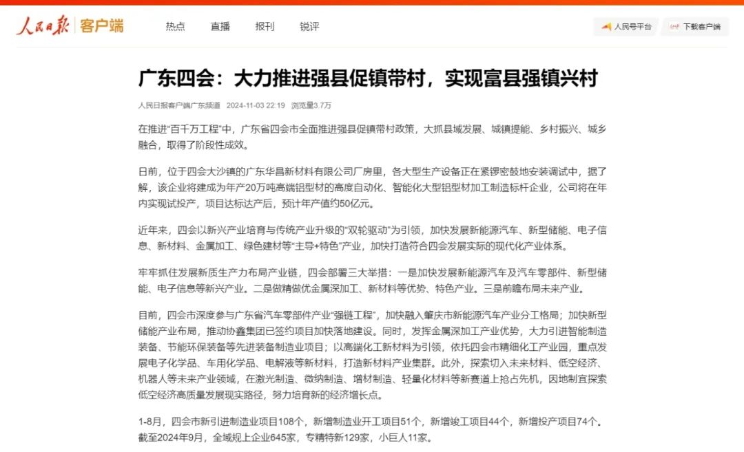 近年来,四会以新兴产业培育与传统产业升级的“双轮驱动”为引领,加快发展新能源汽车、新型储能、电子信息、新材料、金属加工、绿色建材等“主导+特色”产业,加快打造符合四会发展实际的现代化产业体系。