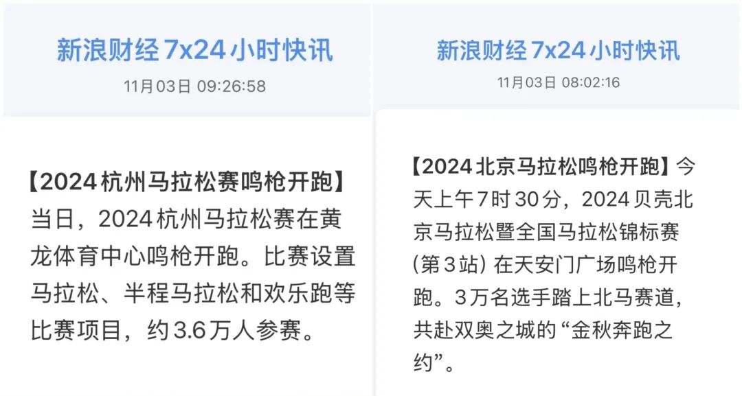11月3日当天,北京马拉松赛、杭州马拉松赛、郑州马拉松赛、宜昌马拉松赛、西安马拉松赛、漠河北极村马拉松赛等纷纷在近十个城市和地区鸣枪举办。3.6万、3万、4万、3.5万、2.2万……这是这些马拉松赛的参赛人数。放一张图,让大家体会下,这是3日北京马拉松的盛况。