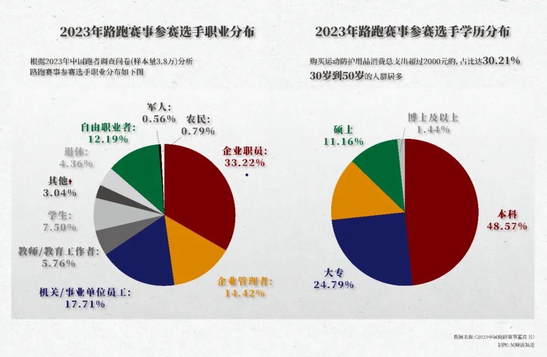 而根据果动科技的《2023中国跑路赛事蓝皮书》数据,去年公路长跑赛事的参赛选手,机关事业单位员工、企业管理者的人群占比达到32.13%,本科及以上学历占比高达61.17%,购买运动防护用品消费总支出超过2000元的,占比达30.21%,30岁到50岁的人群居多。