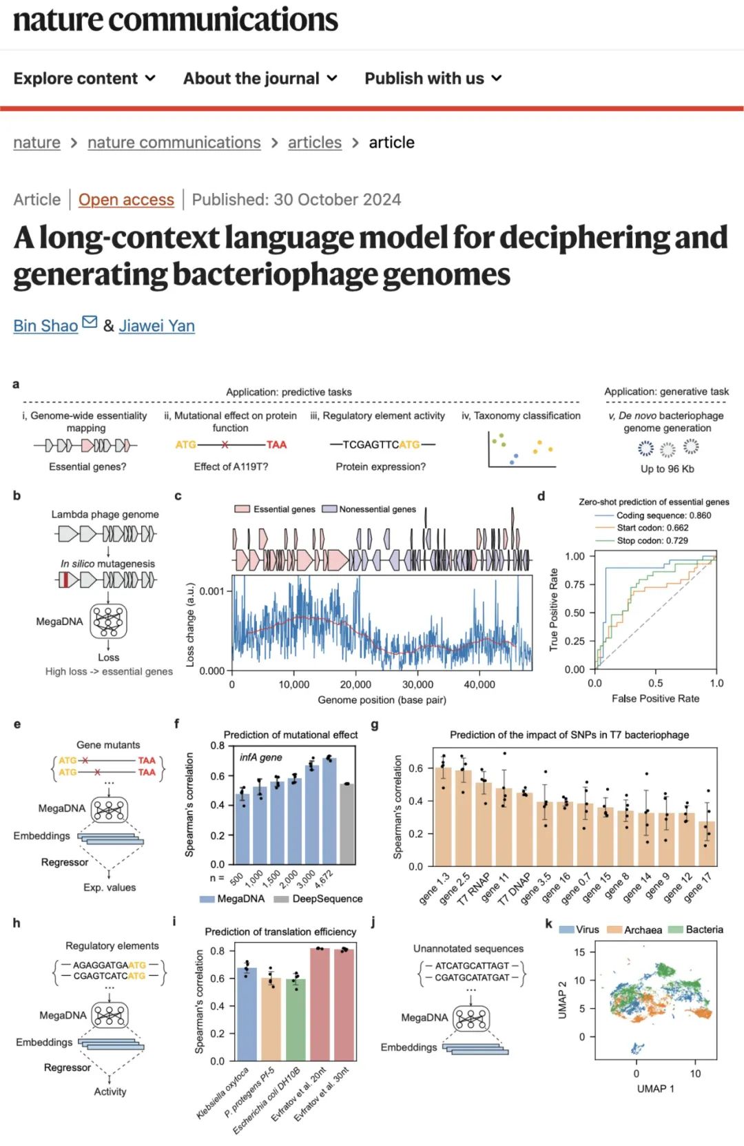 2024年10月30日,北京理工大学邵斌教授课题组在 Nature Communications 期刊发表了题为:A long-context language model for deciphering and generating bacteriophage genomes 的最新研究论文。