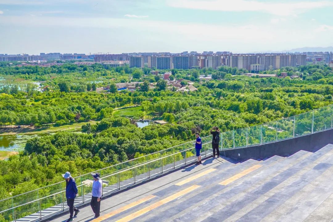 市民在位于丰台的南苑森林湿地公园飞雁台观景平台登高赏景,感受美好生态环境。武亦彬摄