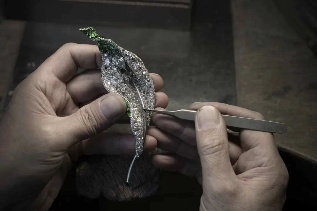 最后就是镶嵌环节。Cindy Chao突破艺术门类的限制把油画的精神带到艺术珠宝的配色里,在作品中挥洒出颜色的张力。