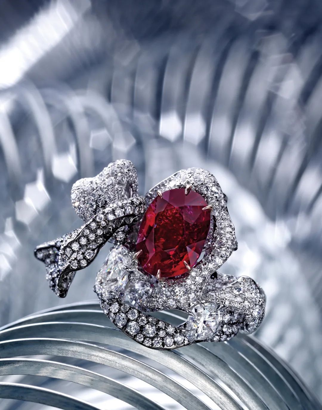 ▲2013年刚好是香港地区苏富比国际拍卖会植根亚洲40 周年,苏富比特邀珠宝师 Cindy Chao 创作了 2013 Black Label 大师系列 Masterpiece XIX 缅甸天然鸽血红红宝缎带戒指。将其作为拍卖目录的封面之作并以六页篇幅详尽推荐这件艺术珠宝作品。这枚重达8.03克拉的缅甸天然鸽血红红宝缎带戒指以2352万人民币的价格在香港苏富比成交,刷新了亚洲当代艺术品拍卖纪录。