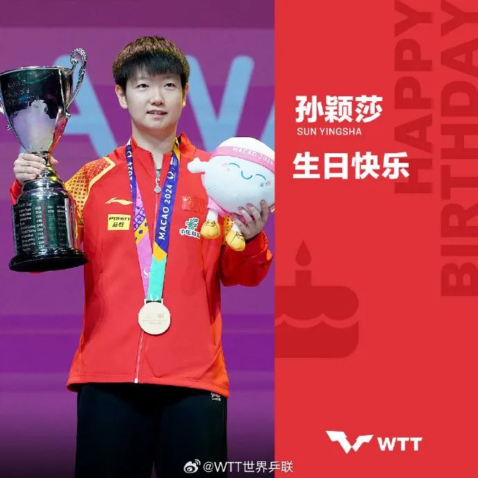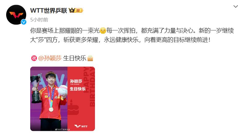 WTT世界乒联发文:你是赛场上那耀眼的一束光,每一次挥拍,都充满了力量与决心。新的一岁继续大“莎”四方,斩获更多荣耀,永远健康快乐,向着更高的目标继续前进!祝孙颖莎生日快乐!