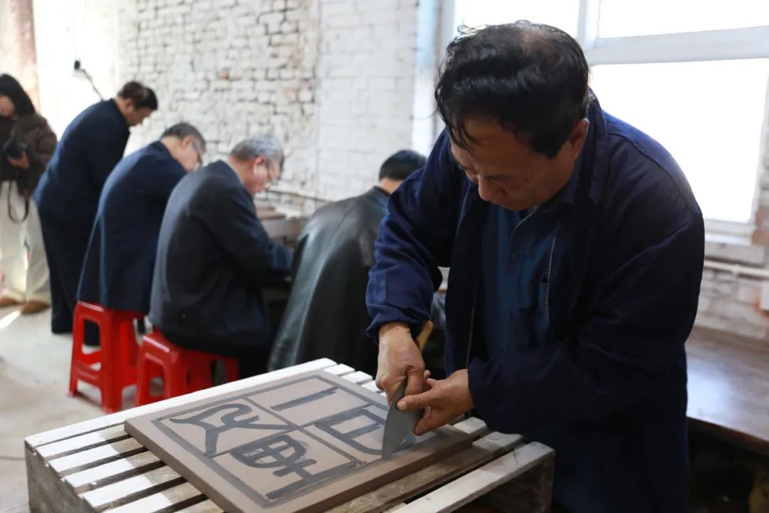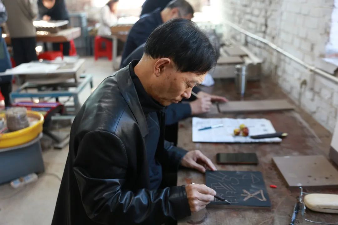 会议结束后,老中青篆刻艺术家们,或刀或竹笔,纵横交错,艺兴高涨,沉浸在艺术的世界里。