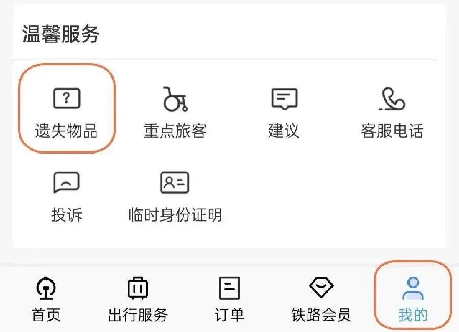 找到“我的”温馨服务中的“遗失物品查找”