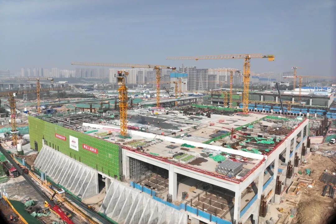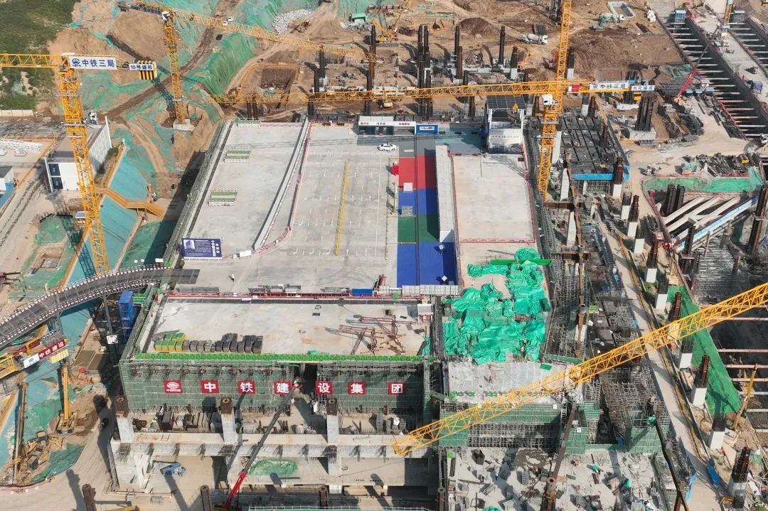 站房西1区、西3区承轨层已全部完成,西1区高架层已完成,西3区部分区域正在钢筋绑扎;侧1区、侧3区±0层已完成楼板浇筑,侧1区5.5米层梁钢筋绑扎及框架柱钢筋绑扎已完成;东1区正在进行桩基、承台及夹层施工,东3区正在进行桩基、承台施工。