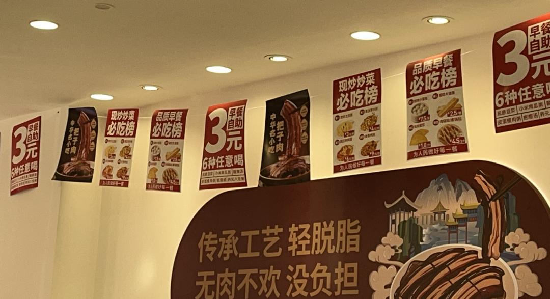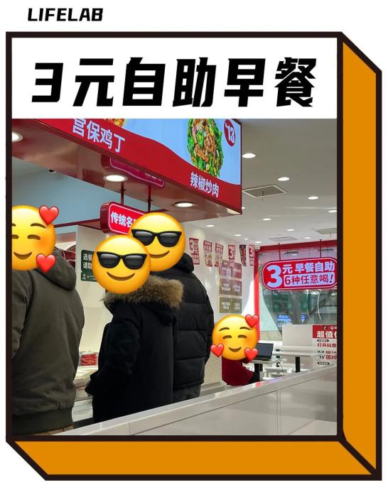 对北漂而言,早饭一直是生活水平的衡量指标。早先打工人会吃20块钱的咖啡贝果套餐富养自己,后来降级到10元的麦门肯门早餐,勉强维持体面。最近打工人看透了,“能花小钱吃口热乎饭比啥都强”,于是纷纷投身3元早餐自助,把家门口的快餐店吃成了社区食堂。