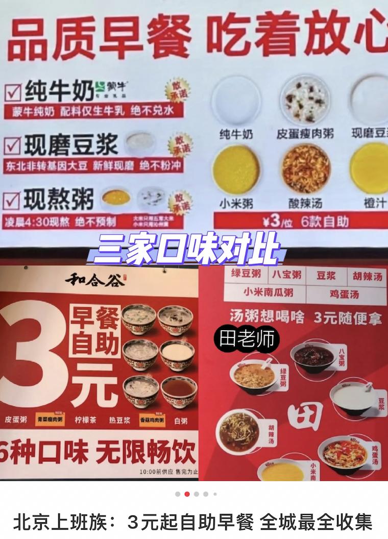 图源@不爱上班研究中心在北京打工人的周围,不少中式快餐店都推出了只花3块钱,就能吃到6到8种粥饮的自助早餐,主打一个让打工人花小钱吃上热乎早饭。