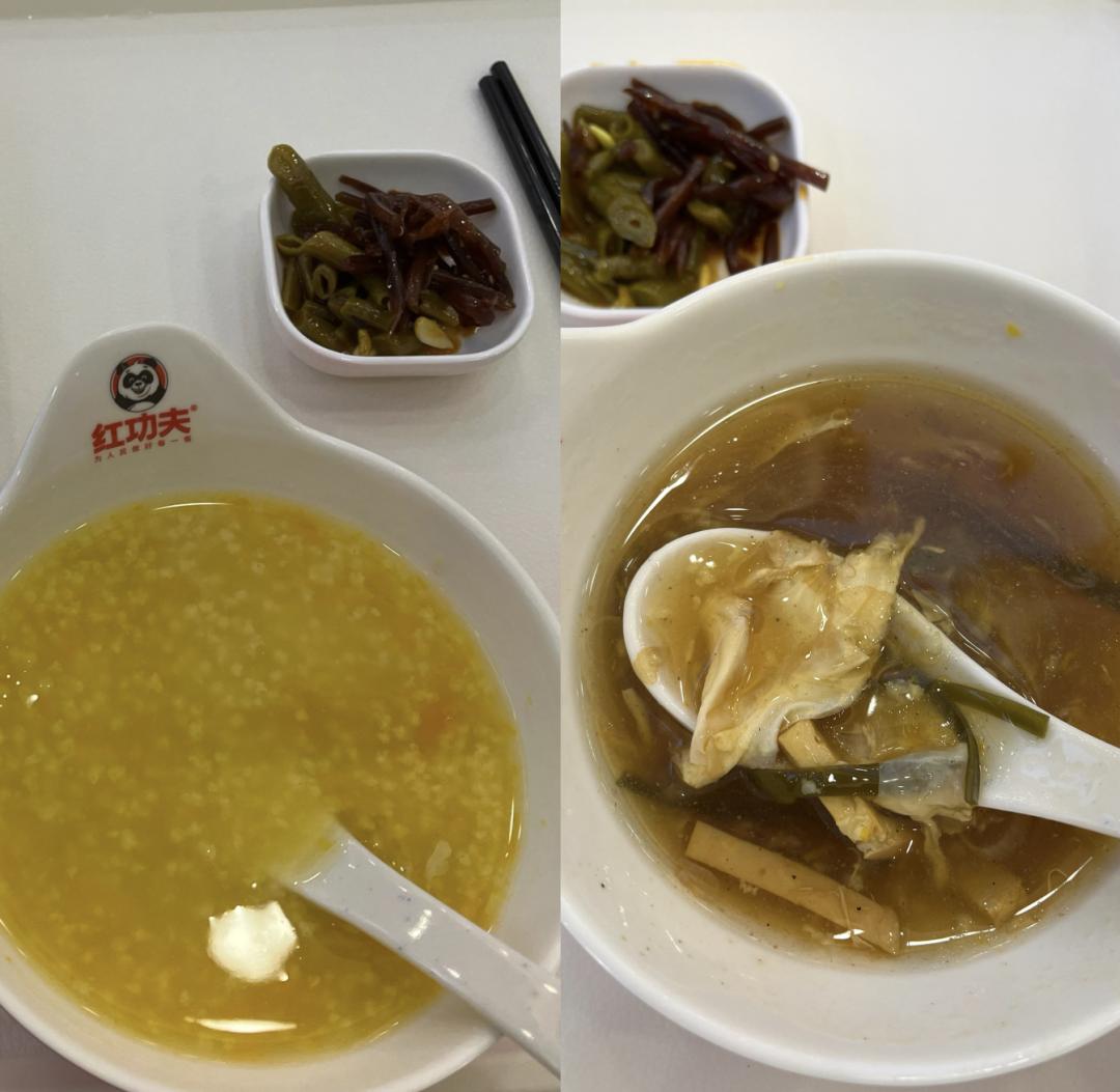 “乍一看只能混个水饱,仔细看牛奶能补充蛋白质,南瓜粥、橙汁能补充膳食纤维。最后再来一碗酸辣汤溜溜缝,鸡蛋木耳海带丝一下肚,你怎能说这顿饭没有营养?”