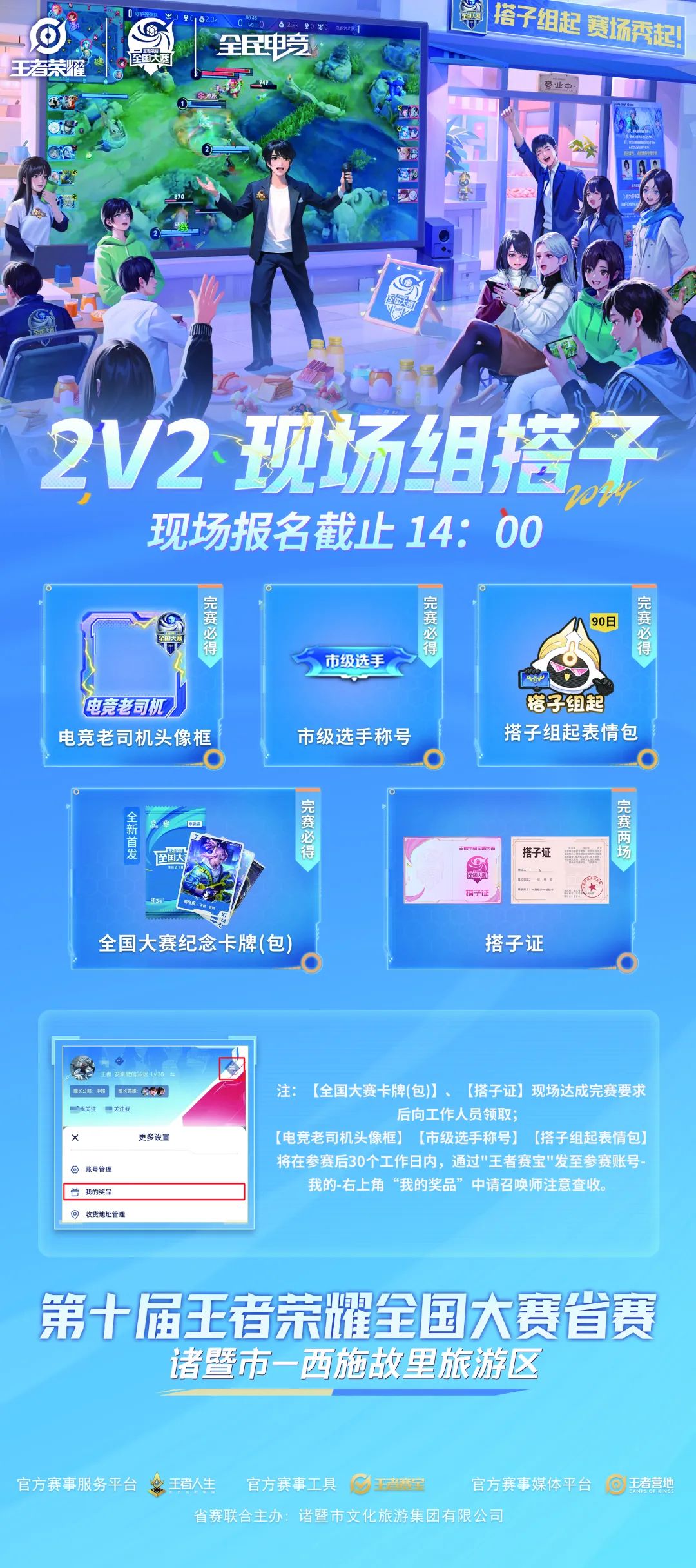 ·本次赛事为王者荣耀官方授权赛事,分为5V5团队赛+1V1单人赛,及面向大众的2V2搭子赛。·本次赛事全程在 西施故里旅游区·乡村道地 进行。