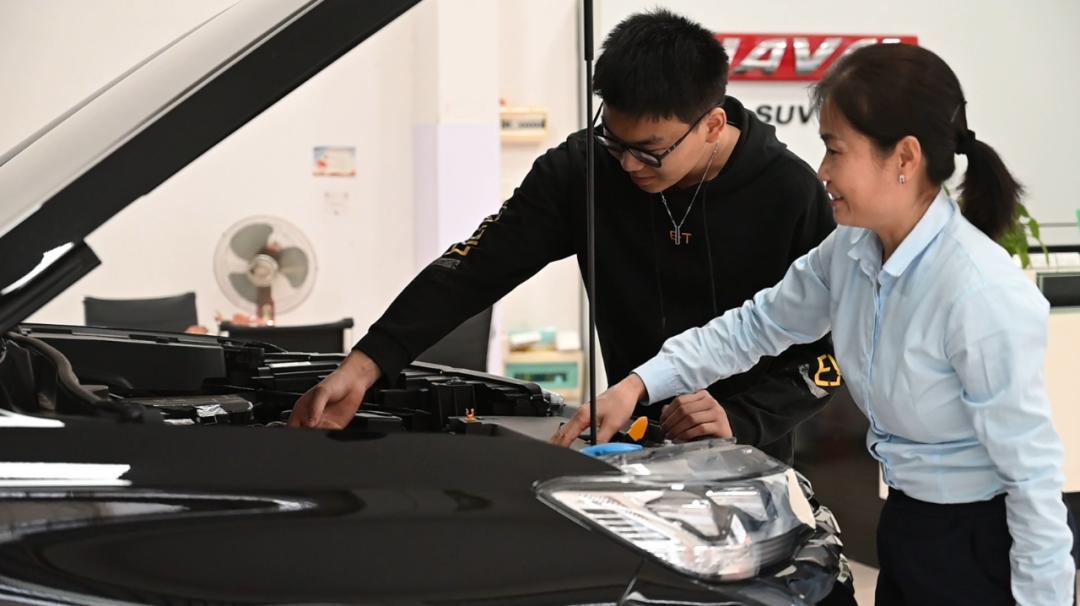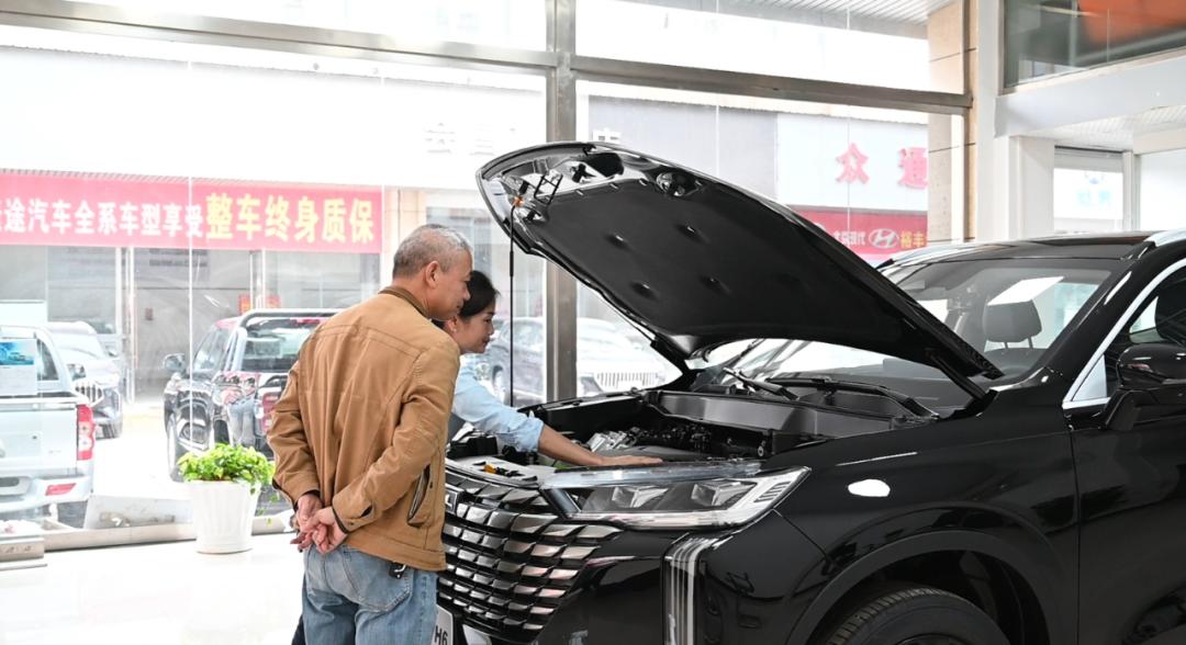 在会昌县汽车市场一家汽车4S店内,导购人员正热情地向顾客介绍产品性能,并详细讲解汽车以旧换新的相关补贴政策。