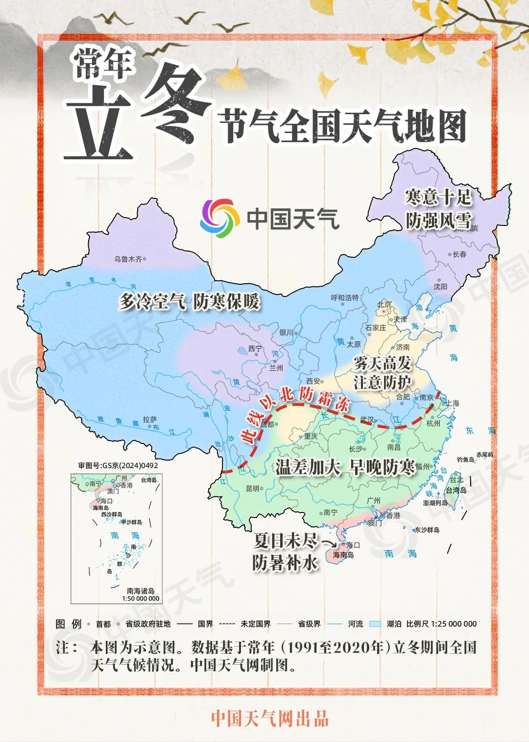 “天水清相入,秋冬气始交。”立冬时节冷空气活动更加频繁,我国南北温差拉大,夏、秋、冬三季并存。除了已经入冬的西北地区、华北、东北地区等地,黄淮至江淮一带也会先后进入气象学意义上的冬天;江南等地秋意正浓,昼夜温差逐渐加大,早晚时段凉意明显;华南南部则是夏日未尽,暑气犹存。