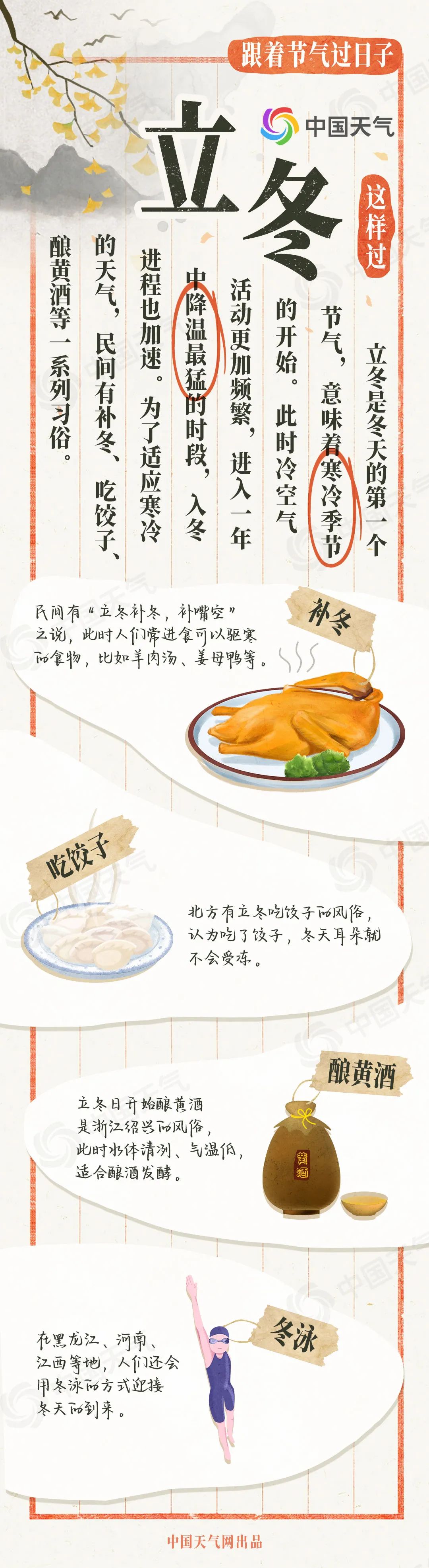 春生夏长,秋收冬藏,跟着节气过日子。今天(11月7日)是冬天的第一个节气——立冬,它的到来意味着寒冷季节的开始。此时,冷空气活动更加频繁,进入一年中降温最猛的时段,入冬进程也开始加速,冬季前沿会抵达黄淮北部、秦岭、川西高原一带。为了适应寒冷的天气,民间有补冬、吃饺子、酿黄酒等一系列习俗。中国天气网特别推出立冬风俗图鉴和立冬全国天气地图,看看这个节气怎么过。