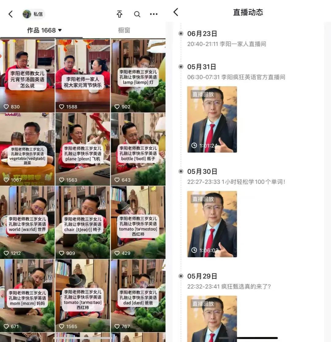 与此同时,借助一场场演讲走红的李阳正在努力适应新的传播方式。目前李阳在抖音共有120余万粉丝,发布了1600个针对教育话题、近期活动的短视频作品。曾经深陷家暴丑闻的李阳在社交平台上放出了大量教导儿女学习的视频,并多次和现任妻子孔德铭一起参与直播。招商人员透露称,李阳老师的妻子是孔子第77代孙,她也希望借助各地的加盟店推进游学业务。