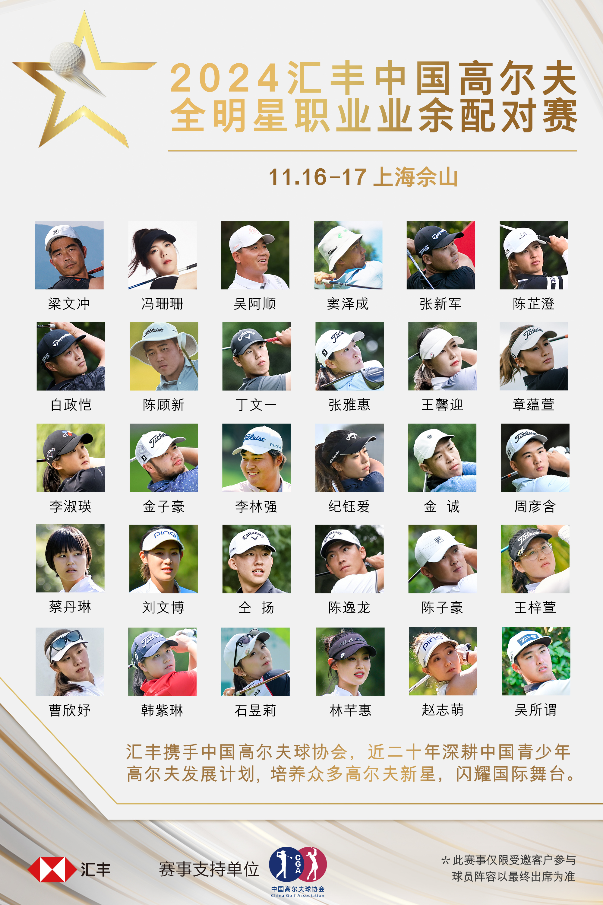 2024汇丰中国高尔夫全明星职业业余配对赛阵容揭晓30位中国知名高尔夫运动员将于11月16日至17日齐聚上海佘山,包括梁文冲、冯珊珊、吴阿顺、窦泽成、丁文一、金子豪、张雅惠、王馨迎等。