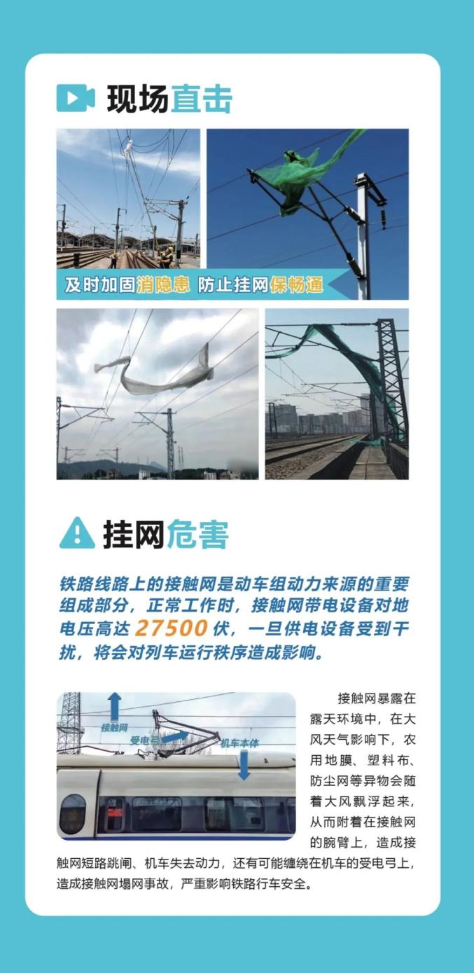 近年来,在铁路线路安全保护区的邻近区域私搭乱建现象较多,彩钢瓦、铁皮、塑料薄膜等建筑原材料,其材质通常都很轻便,且加固力度不够。如遇大风、雨雪等恶劣天气,极易从建筑物上脱落,被吹刮到铁路线路上。若是塑料薄膜、防尘网、遮阳网等轻飘浮物附着在接触网的腕臂上,就会造成接触网短路跳闸、机车失去动力、列车晚点,严重干扰铁路运输秩序;若是彩钢瓦、铁皮、广告牌等硬飘浮物掉落到线路内,就很有可能砸坏铁路设备设施,一旦与正在运行的列车相撞,将造成铁路交通事故,严重危及列车及旅客生命财产安全。