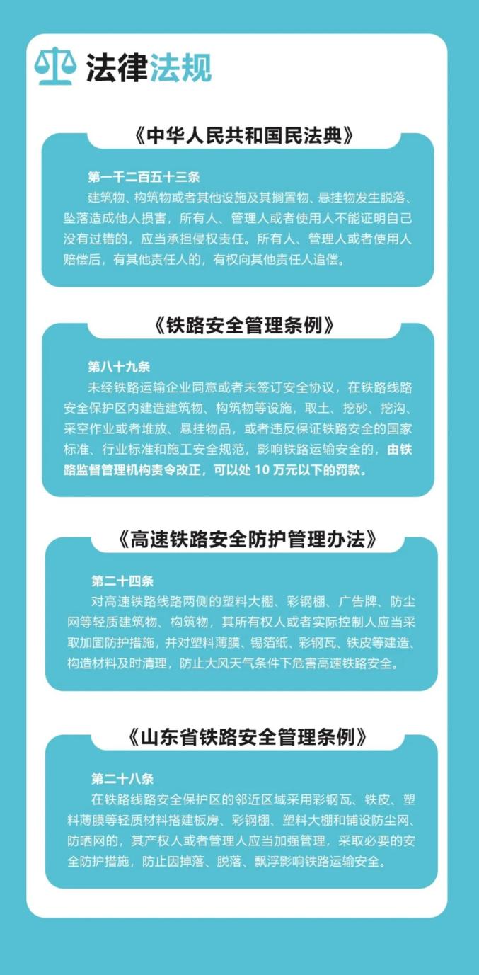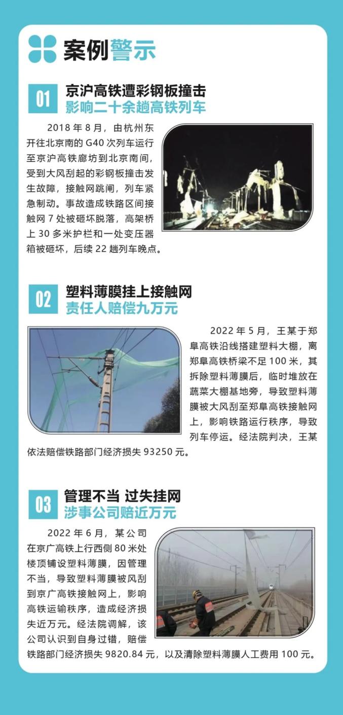 劳作辛苦,过失追责。在铁路线路安全保护区的邻近区域,采用轻质材料搭建铁皮板房、彩钢棚、塑料大棚和铺设防尘网、防晒网,请参照《铁路沿线彩钢板房塑料大棚防尘网防晒网加固参考指南》,避免因管理过失,引发严重后果。会受到追责赔偿处理,甚至承担刑事责任。