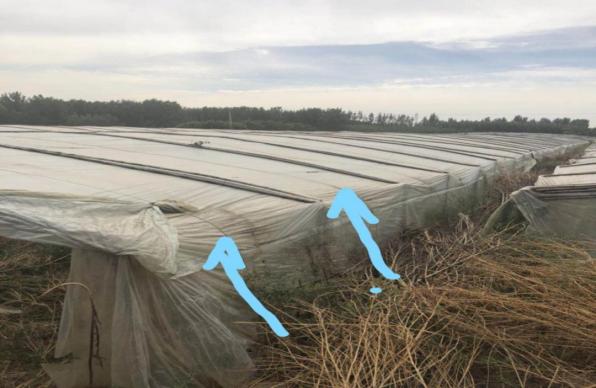地锚钢丝绳(或打包带)加固示例图2.棚顶钢丝绳尼龙网加固