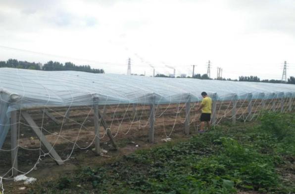 在塑料大棚顶部先用钢丝绳紧固大棚顶部塑料膜,再用尼龙网罩住顶部。钢丝绳间距2~2.5m。