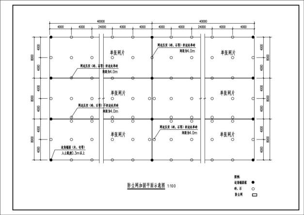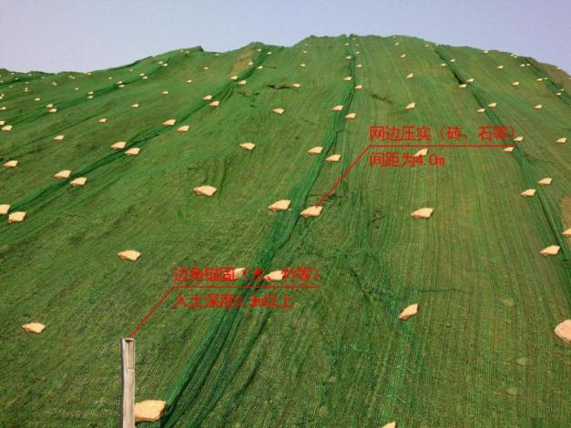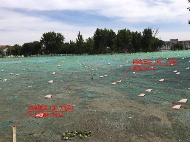 防尘网每个网片纵横以4米×4米的间隔均匀设置压实点(网片织连在一起时织连处可以骑缝设置压实点),每个压实点用约5公斤重的废弃砖石块覆压,每个网片的4个网角各设置1个锚固点,每个网角用绳索牢固栓系在木(竹)橛锚桩上,锚桩直径40mm以上、长度500mm以上并钉入地下400mm以上,以每个网片规格8米×40米为例: