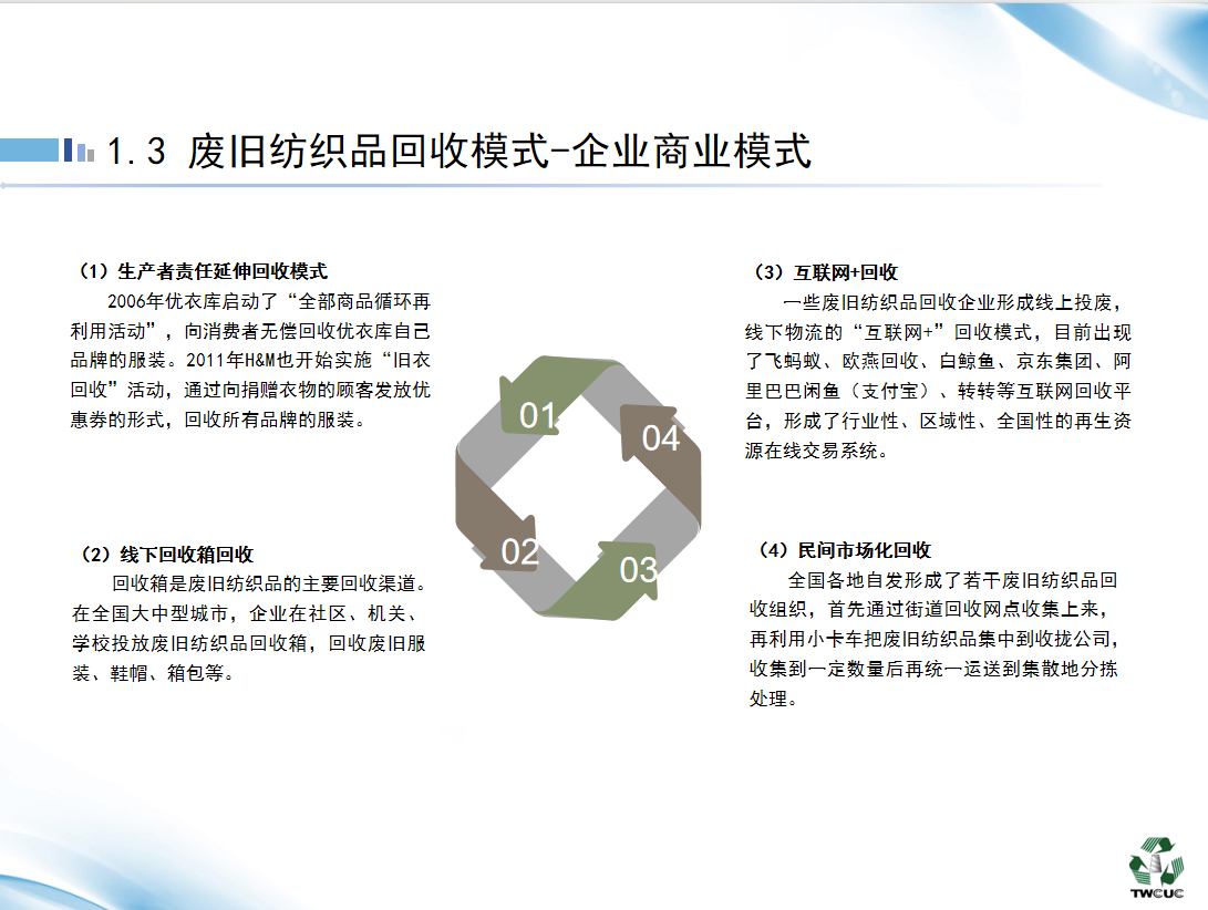 就我国废旧纺织品的整体回收与利用情况而言,随着能力的提升及资源效率和效益的显现,自2019年至2023年,废旧纺织品的产生量与利用量均呈逐年递增趋势。据我们协会废纺专委会的初步测算,2023年废旧纺织品回收利用量为550万吨以上,回收利用率约为23%。此外,依据有关研究机构的测算方法,我们还估算了相应的二氧化碳减排量、水资源节约量、化肥与农药的减少使用量,以及估算了节约的土地与原油数量。当前,我国废旧纺织品的回收主要存在两大模式:一是以政府为主导,涉及住建部的生活垃圾回收、商务部的再生资源回收以及民政部的公益慈善回收等多个方面。政府部门从多个维度对废旧纺织品提出了具体的回收要求。二是企业的商业模式,包括一些品牌自发开展的回收利用活动,如优衣库自2006年起回收自身品牌的废旧纺织品,H&M自2011年起开始回收其他及自身品牌的服装。此外,线下回收箱、互联网+回收等模式也日益普遍,如飞蚂蚁、白鲸鱼、欧燕等品牌,它们与支付宝、微信、顺丰等平台合作,开展线上回收。同时,我国还存在传统的民间回收模式。