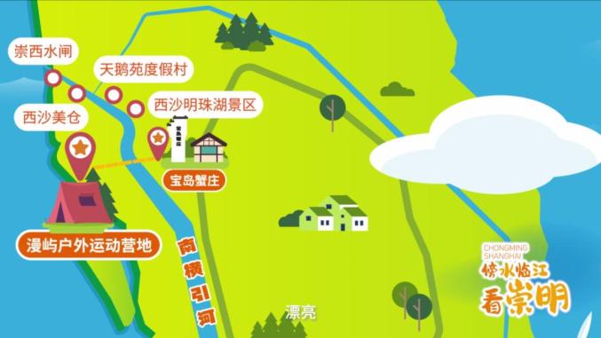 当初在选址时,杨敏玮被崇明绿华镇试点探索的“生态清洁小流域”建设深深吸引,这里通过水系连通,将分散在四处的景点相连,串联起沿岸美景。如今,营地前的月亮湖已实现畅通至西沙明珠湖景区内的西沙湿地沿线,游客可以在更加广阔的水域范围内感受崇明水上风光。