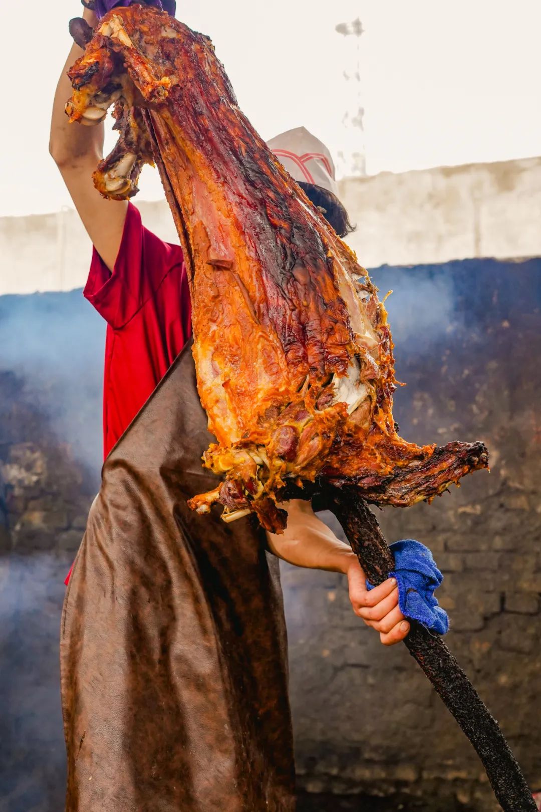 经过漫长等待,出炉的烤全羊外皮金灿诱人,趁热咬一口,能感受到酥脆的外皮爆开满口香脂,外侧的肉满是挂糊香气,而内部依旧嫩滑多汁,原汁原味。烤全羊,怕是视觉冲击最直接、饕餮之感最猛烈的烤肉了。