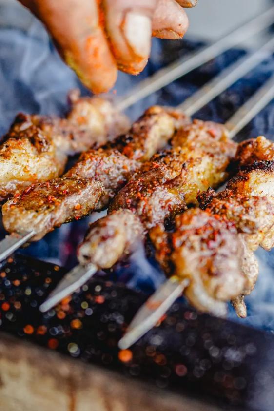 不过,就像兰州没有兰州拉面一样,新疆也没有洒满孜然粉、辣椒面的“新疆羊肉串”,只有烤肉(新疆烤肉以羊肉占绝对比例,牛肉都少)!为新疆烤肉注入灵魂的,不是那薄薄一层衬托羊肉本味的调料,而是那块藏在肉串中的丰腴羊尾油。