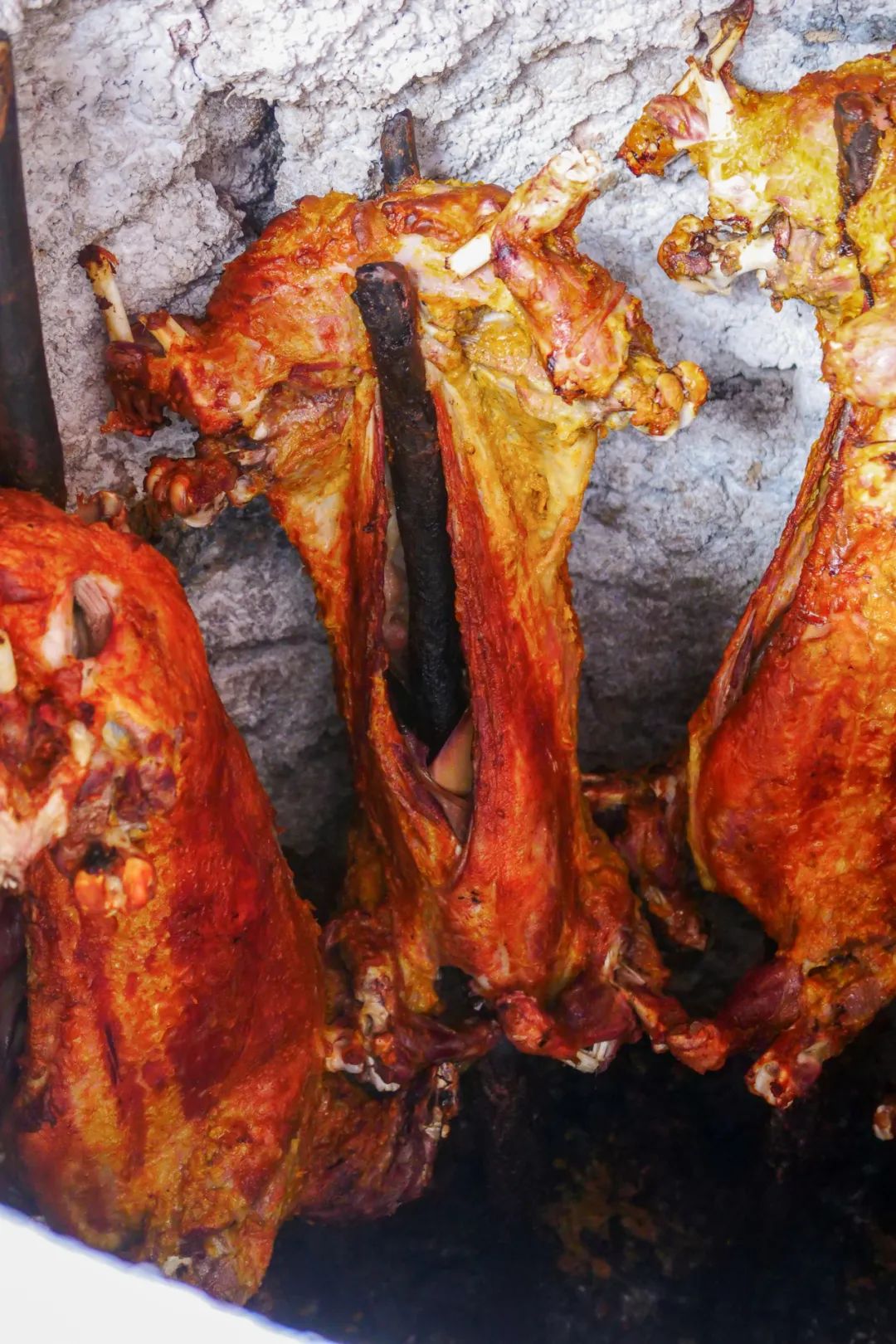不得不说,馕坑是新疆人的吃羊神器,新疆烤全羊也多是用馕坑烤熟的。整只白条羊用大树枝做钎子,在外皮裹满蛋黄、姜黄、盐、孜然、胡椒调制的挂糊,用盐水熄灭碳火后,再放入坑中,坑口盖上面门帘焖烤。