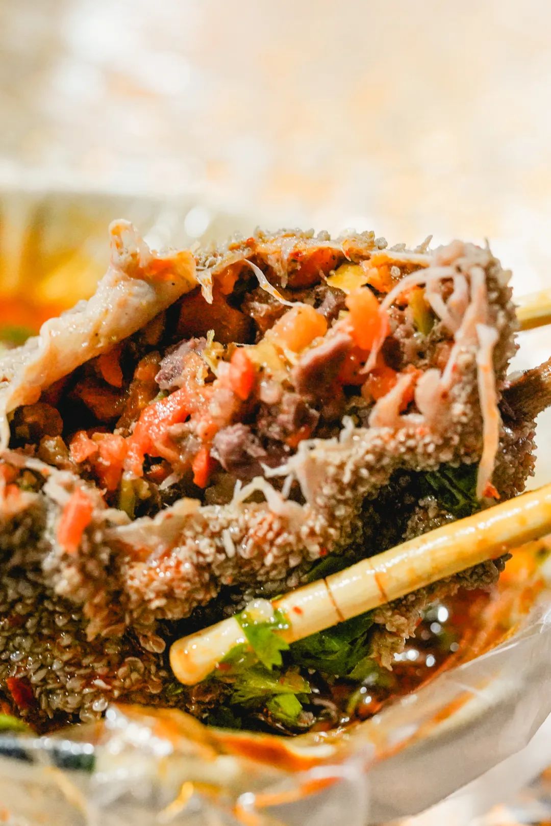 更大众化的还有胡辣羊蹄,软糯弹牙的羊蹄,搭配滋味十足的汤汁,往往能把食客辣到涕泗横流。而看似黑暗的羊头,在点餐付钱的功夫,就被摊主拆卸成一碗肉,连羊脑都重新煎好。没有了骇人的头骨,食客只需要糊里糊涂的感受羊头层次丰富的口感,一边猜刚刚那一口是腮帮子还是眼睛。