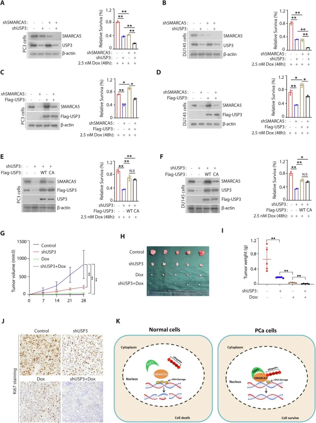 为了测试USP3-SMARCA5轴是否可能作为癌症治疗的靶点,研究人员在PC3细胞或DU145细胞中单独或同时沉默USP3或SMARCA5,并检测在多西他赛处理后的细胞存活情况。研究人员发现,USP3或SMARCA5沉默促进了PC3细胞和DU145细胞对多西他赛的敏感性。此外,在USP3耗竭细胞中沉默SMARCA5进一步增强了这些治疗的效果。为了进一步确认USP3对化疗抵抗的调节依赖于其催化活性,研究人员将沉默的USP3细胞转染表达野生型USP3或C168突变质粒,并检测在多西他赛处理后的细胞存活情况。接下来,研究人员进一步询问USP3是否可能作为前列腺癌体内治疗的潜在靶点。如图1G-I所示,USP3的耗竭或多西他赛治疗同样抑制了肿瘤生长,而USP3和多西他赛的联合沉默进一步减少了异种移植模型中的肿瘤生长。在Ki67染色试验中也观察到了类似的效果。研究人员还确认,在各自的肿瘤组织中,确实敲低了USP3,而USP3敲低降低了SMARCA5的表达,而多西他赛治疗对它们的蛋白质表达没有影响。这些数据表明,USP3以SMARCA5依赖的方式调节前列腺癌细胞对多西他赛的细胞反应。